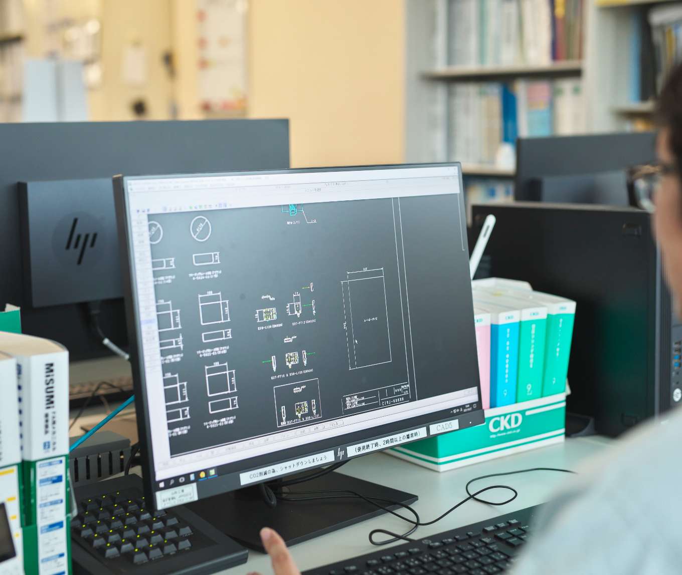 簡単な設備であっても、設計から組み立て、検証までには4カ月程度の時間がかかります。近年は人の手を使わない自動化に対応した設備も増えていますが、その場合、複雑なプログラミングも行う必要があり、さらに完成までに時間を要します。その中では自分でどんな設備がふさわしいかを考え、設計するのみならず、部品の購入や選定も行いますし、組み立てにも立ち会って細かな部分まで確認します。ソフトウェアのプログラミング、テストや調整なども私たちの役割で、すべきことはまさに山積みです。